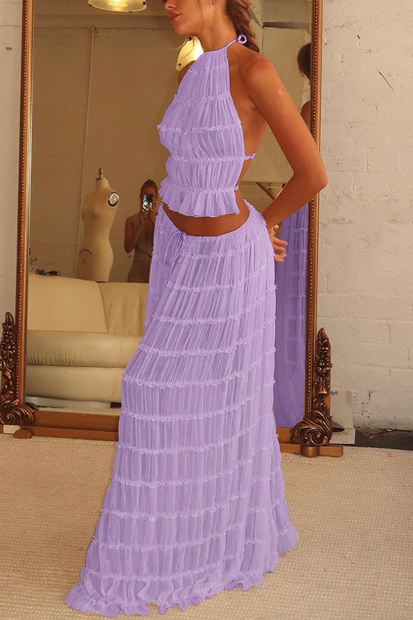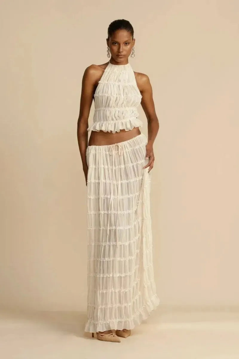 - Maxi Skirt with Drawstring Waist: The matching skirt is floor-length, with a drawstring waist that allows for a custom fit. The skirt features tiered, ruffled layers that mirror the top, creating a cohesive and stylish look.